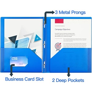 - ASSORTED COLORS & LARGE CAPACITY: The folders come in black, blue, yellow, green, and red, making it easy to distinguish their function, purpose, or categories. This allows for better file management. The two pocket prong folders have 2 inner pockets, 1 business card slot, and 3 prongs for fastening 3-hole punched paper. Each pocket can hold 50+ sheets.