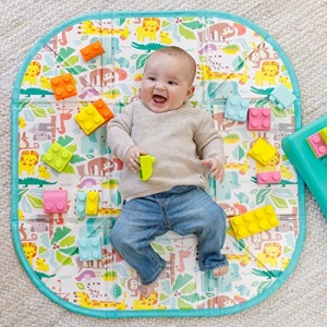 Details: The Infantino Super Soft 1st Building Blocks Activity Station is a fun and stimulating 22-piece play set that offers a world of play possibilities for infants and toddlers. The 2-piece storage box doubles as an activity mat and building base. Removing the storage lid allows the “structured” walls to fall flat into a colorful activity mat, unveiling the 20 super soft building blocks stowed inside. This activity station introduces grasping and stacking with 20 soft, squeezable, yet durable, and teethable perfectly sized blocks for little hands to hold. Infants and toddlers will delight in the sensory and developmental fun this set provides, like building tall towers, identifying colors, or soothing their tender gums. The versatile activity mat could also be used during other play activities, allowing you to offer your baby a comfortable play space outside of block time. When playtime is over, it’s easy to clean up and store this activity station–the activity mat folds into a storage box perfectly sized to house all of the soft blocks (and spacious enough for other toys, too) and the pegged building base lid. All surfaces can be easily wiped clean between uses. Parents and babies will love these soft-squishy, ouch-free blocks that are soft enough to step and teethe on. Explore a world of more play possibilities with the Infantino Super Soft 1st Building Blocks Collection!