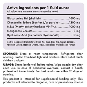 - Yummy bacon flavour – 32oz for medium to large breeds. An arthritis supplement that your canine or feline will drool for. Simple to pump over food, mix and serve! Picky eaters love the taste and will beg for it on their food.