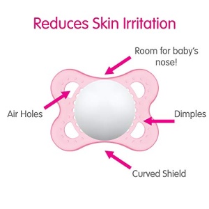 - SYMMETRICAL DESIGN: The breastfeed pacifier for babies is fun and functional. The curved shield with wide openings are always right-side up and prevent skin irritation with maximum airflow.