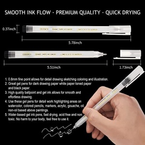 • SMOOTH INK FLOW: High quality ballpoint and gel ink allows for smooth and effortless drawing. flows nicely, no skipping. Great for embellishments and accents or creating reflections and highlights in artwork. Use these gel pens for detail work highlighting areas on watercolor, colored pencils, markers, acrylic, gouache, oil, non-oil based above paintings.