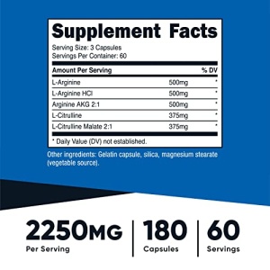 Details: Nutricost’s Nitric Oxide Booster has 500mg of L-Arginine, 500mg of L-Arginine HCl, 500mg of Arginine AKG 2:1, 375mg of L-Citrulline, and 375mg of L-Citrulline Malate 2:1 in every serving. Each bottle contains 180 capsules and 60 servings. If taken according to recommended use, one bottle is a 2 month supply. These Nitric Oxide Booster capsules are non-GMO, gluten free, and tested by independent ISO accredited laboratories.