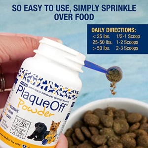 Details: ProDen PlaqueOff animal is an easy way for those dog and cat owners to care for their pet’s teeth who don’t have the patience or inclination to brush their dog or cat’s teeth regularly. The product comes in powdered form and it is simply added on a daily basis to dry or wet food. Dogs and cats like the taste of the small amount that is added. Proden plaqueoff animal does not rely on topical application or friction. The product is ingested and works systemically. Additional Information The natural compound in the product comes out through the saliva and works to break down the bacterial biofilm that forms on the teeth and gums. This is how the natural bacteria in the mouth take hold onto the teeth and gums, colonizing and creating the oral problems of plaque and tartar, bad breathe and gingivitis. It does not change the ph of the mouth or kill off the normal levels of bacteria. Proden plaqueoff has been proven to reduce plaque and tartar on the teeth and gums, depending on composition, diet and how long it has been there. It then works to prevent bad breath, plaque and tartar from returning. Patients generally begin to see results over a 2-8 week period, and will see further benefits with continued use. Proden plaqueoff animal is made from a specific strain of selected seaweed harvested from above scandinavia. This seaweed has developed a natural defensive mechanism against bacterial biofilm. The product is made only from this seaweed and has no additives or chemicals added. It is human grade and human tested.