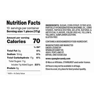 - Ingredients: Sugar, Corn Syrup, Citric Acid, Partially Hydrogenated Palm Kernel Oil, Corn Starch, Tapioca dextrin, Gelatin, Natural and Artificial Flavors, Color (Red 40, Yellow 6, Yellow5), Sunflower Lecithin.